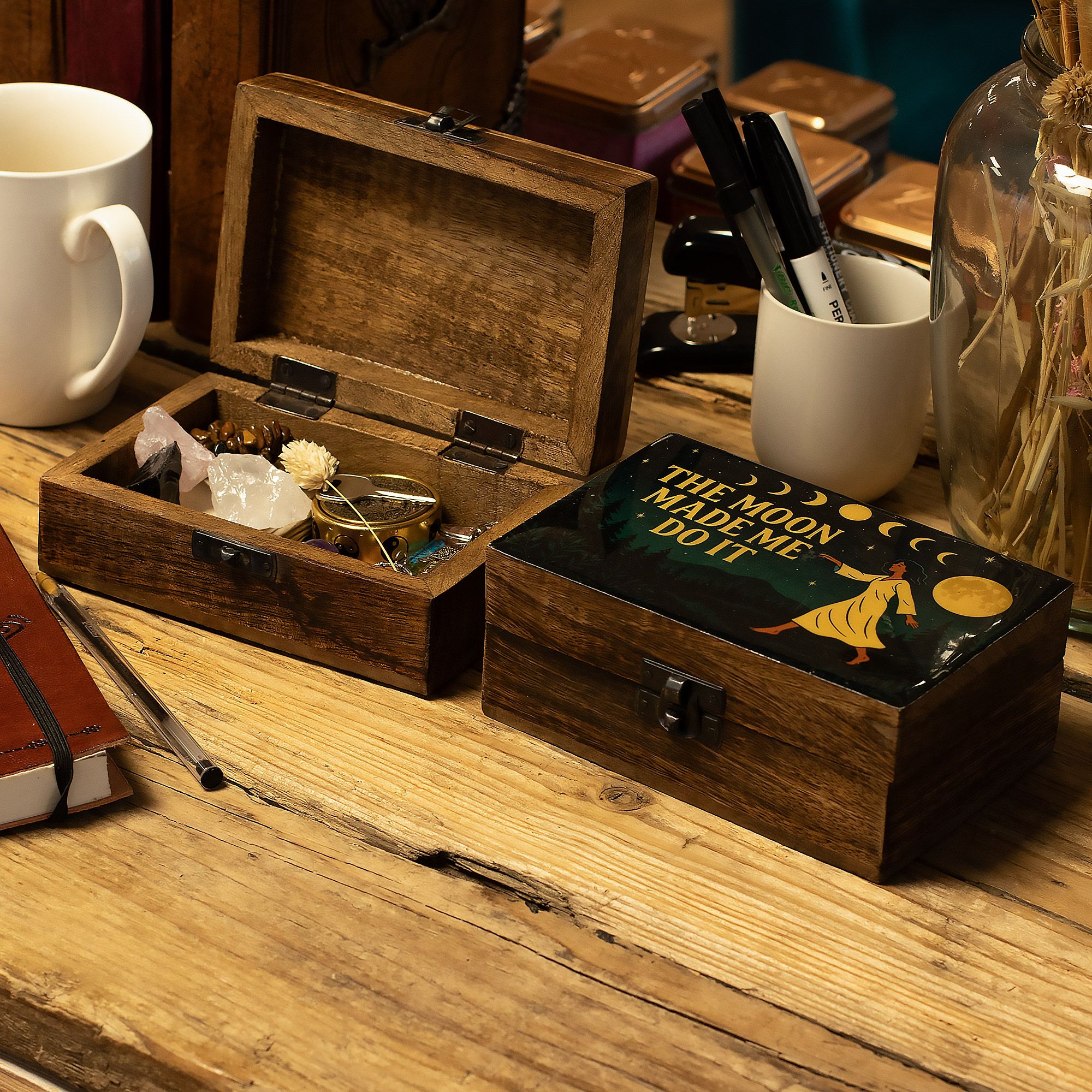 Esta caja de madera de mango de tamaño medio reúne humor, intuición y energía lunar en una sola pieza bellamente ilustrada. La tapa esmaltada presenta el diseño The Moon Made Me Do It, con fases lunares, un bosque nocturno y una figura onírica que se mueve bajo una luna llena resplandeciente. Se siente juguetona, expresiva y un poco traviesa.