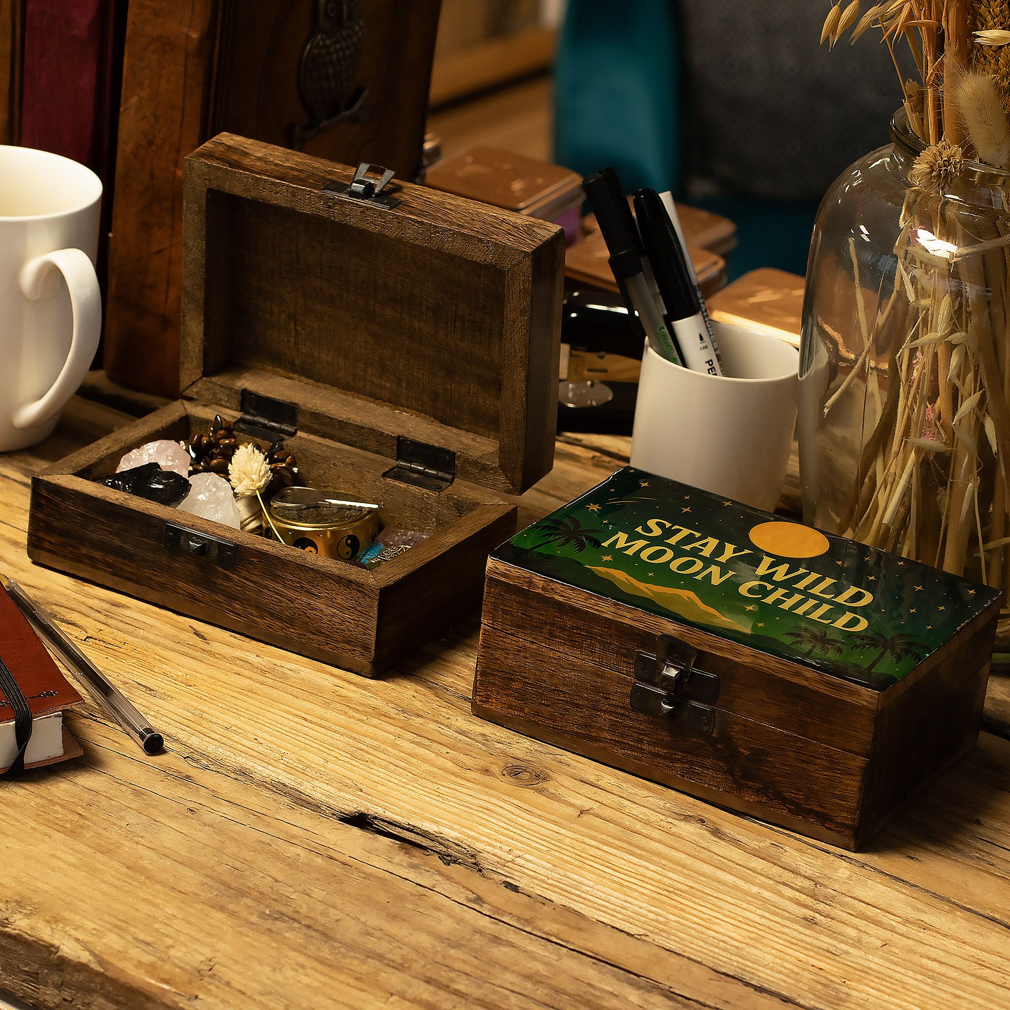 Esta caja de mango de tamaño medio ofrece un poco más de espacio para las cosas que más importan. La tapa esmaltada presenta el diseño Stay Wild Moon Child, con cielos iluminados por la luna, montañas lejanas y siluetas de palmeras que crean un estado de ánimo tranquilo de viajero que se siente a la vez arraigado y libre.