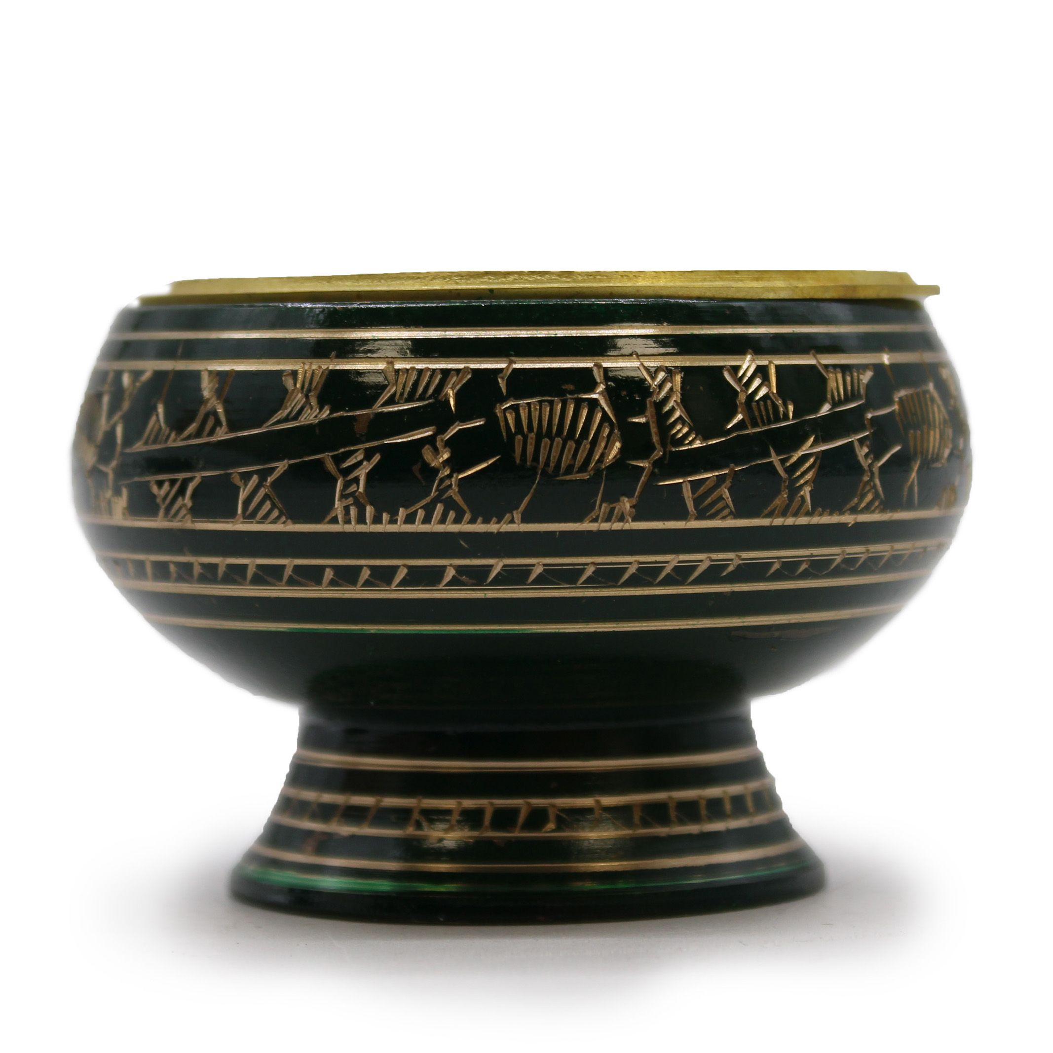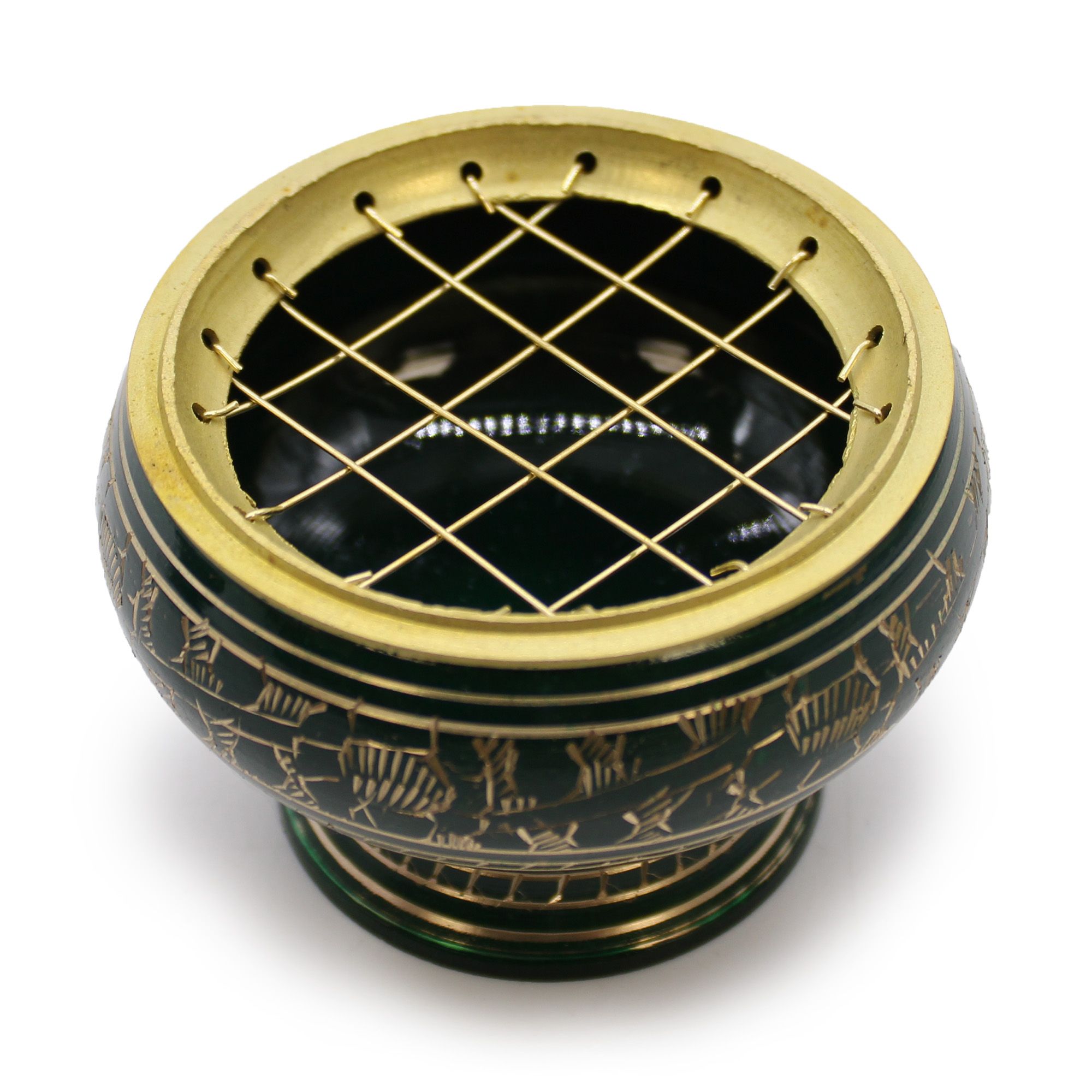 Este cuenco alto de incienso, adornado en un armonioso color verde con delicados detalles dorados, está inspirado en el chakra del corazón, el centro del amor, la compasión y la sanación emocional. Hecho a mano en la India con latón de primera calidad, combina artesanía tradicional y simbolismo espiritual para ofrecer una pieza única que eleva cualquier espacio.