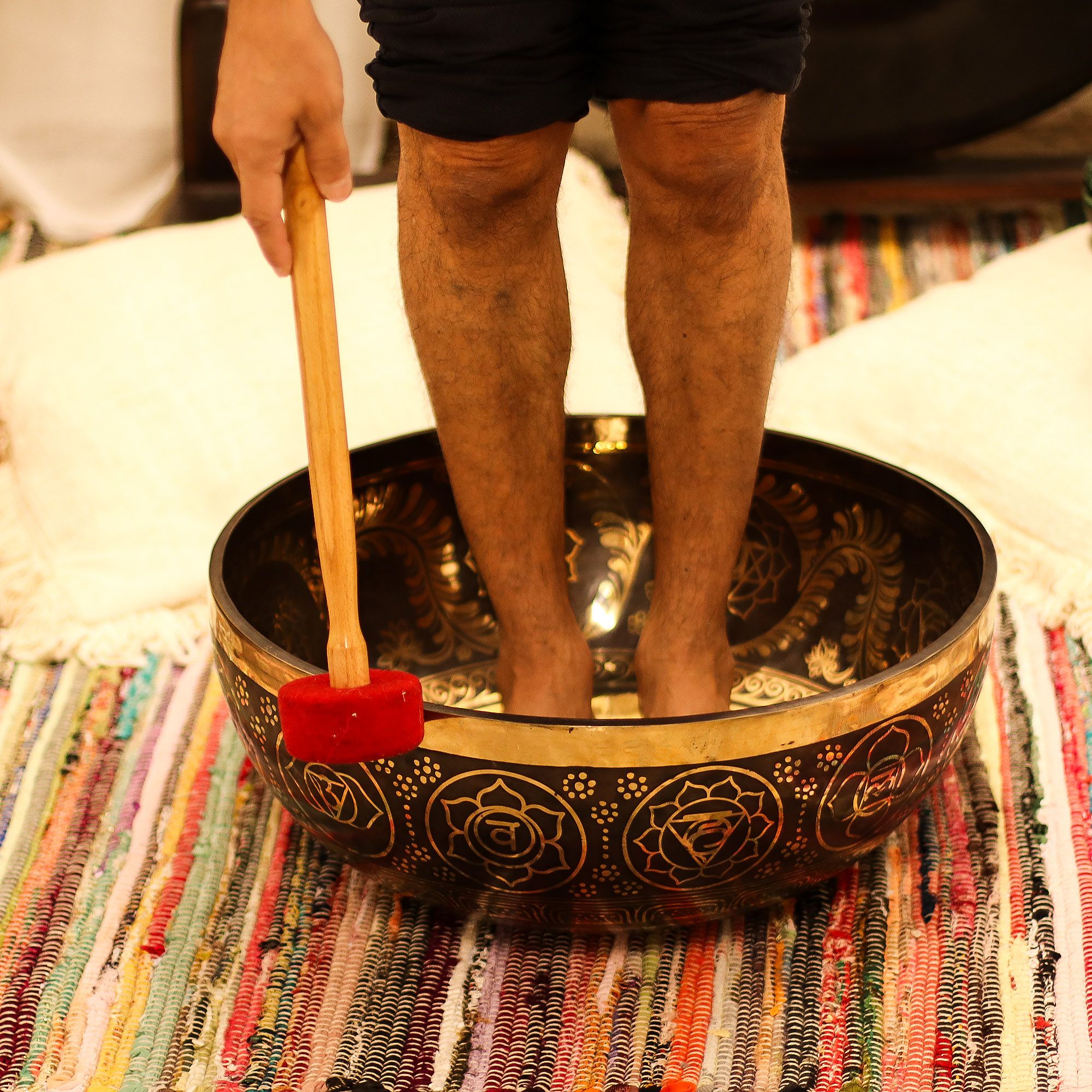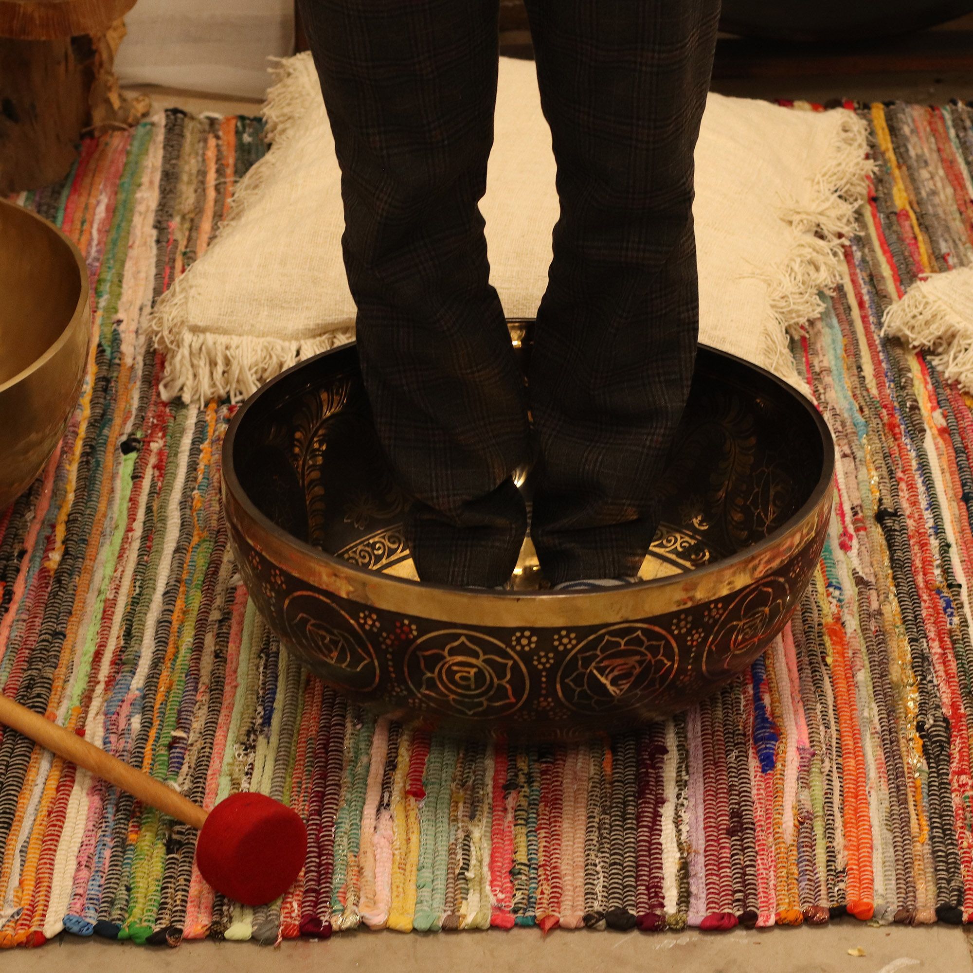 Experimenta una resonancia poderosa y estabilizadora con este cuenco vibracional para pies con grabado. Con un diámetro de 50cm y un peso de 10.7kg, está diseñado para que los practicantes se paren dentro, permitiendo que las ondas sonoras viajen a través de todo el cuerpo para una experiencia profundamente inmersiva.