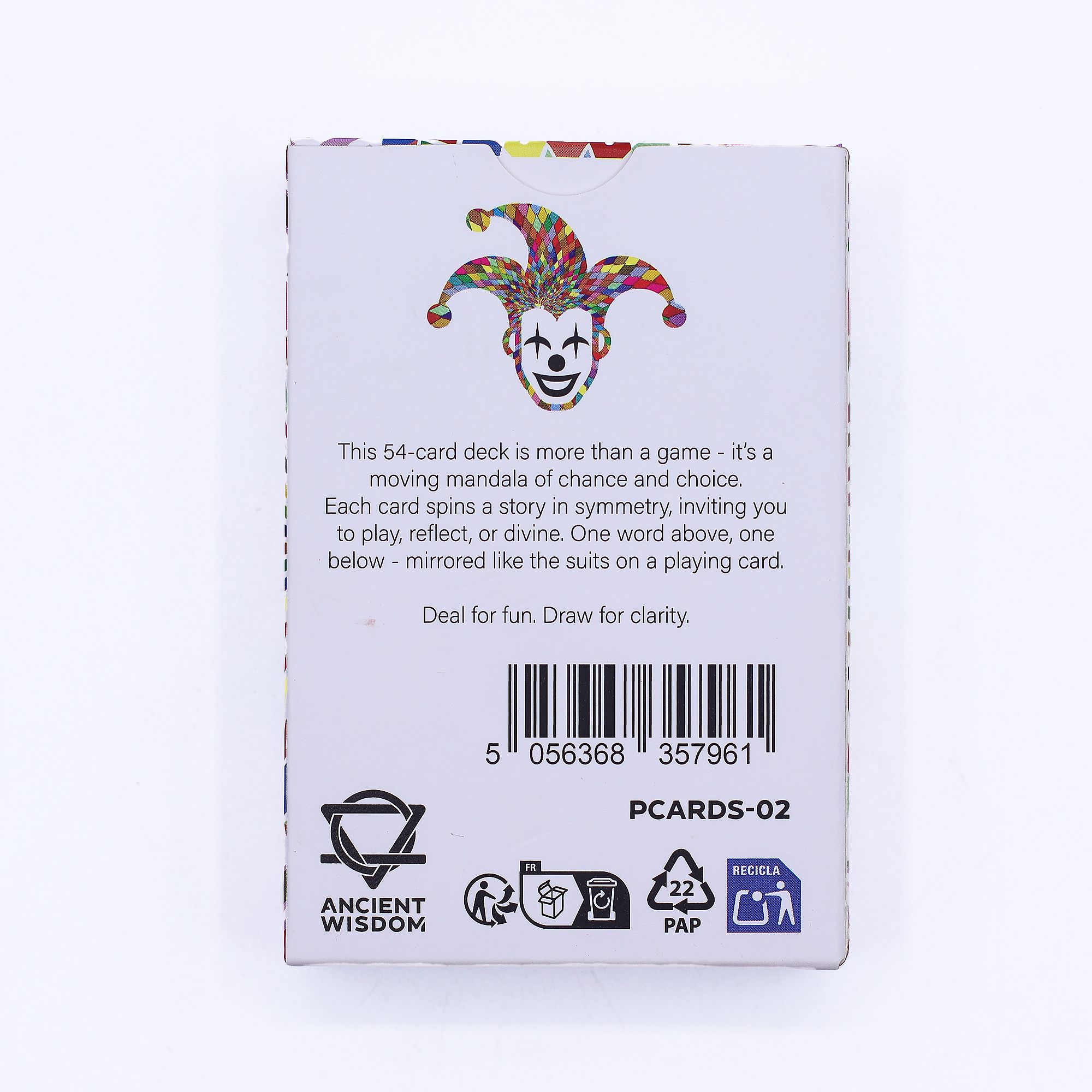 Esta baraja luminosa de 54 cartas aporta color, claridad y reflexión a tu mesa. Úsala para juegos de cartas clásicos o como un oráculo para la introspección consciente — cada diseño de mandala refleja el equilibrio de las elecciones de la vida y la armonía entre el juego y el propósito.